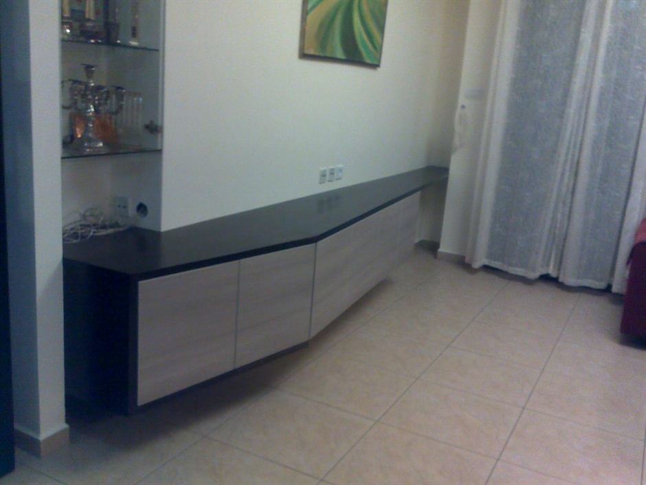 - מזנון לסלון בגימור פורמאיקה מזנון צף וארוך בגימור פורמאיקה. הפורמאיקה מפתיעה בעיצוב שהיא מקנה לסלון. קוים נקיים ויפים.