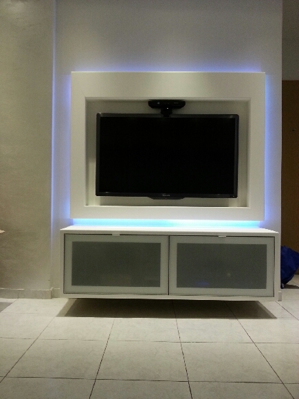 - מזנון ומסגרת לטלויזיה הארון והמסגרת נבנו מעץ ונצבעו בצביעה רגילה, כצבע הקיר. התאורה האחורית שולבה בתוך המסגרת ואף נבדקה לפני התקנת המסגרת על הקיר. המראה מושלם, בייחוד ביחס לעבודת גבס. הפינות מעוגלות קצת, הקוים ישרים וברורים והזויות ישרות.